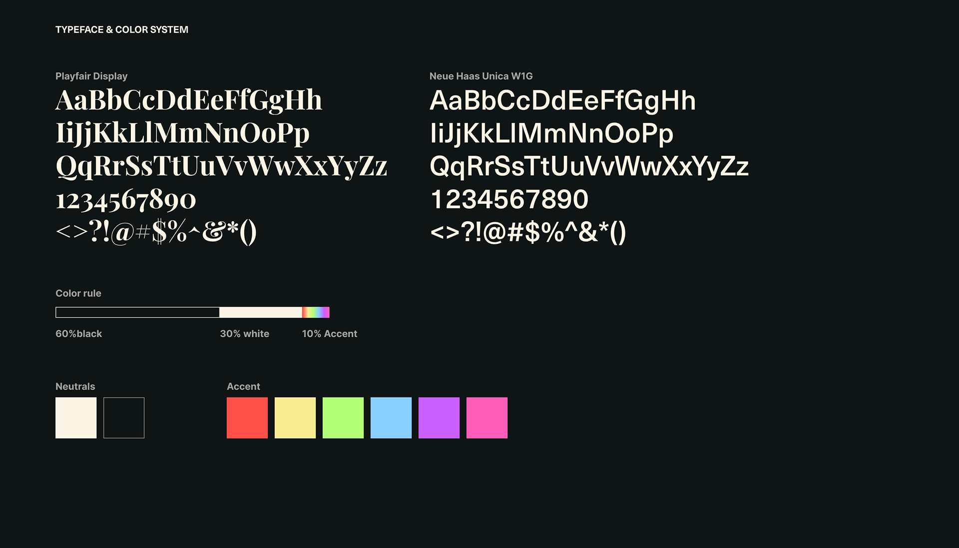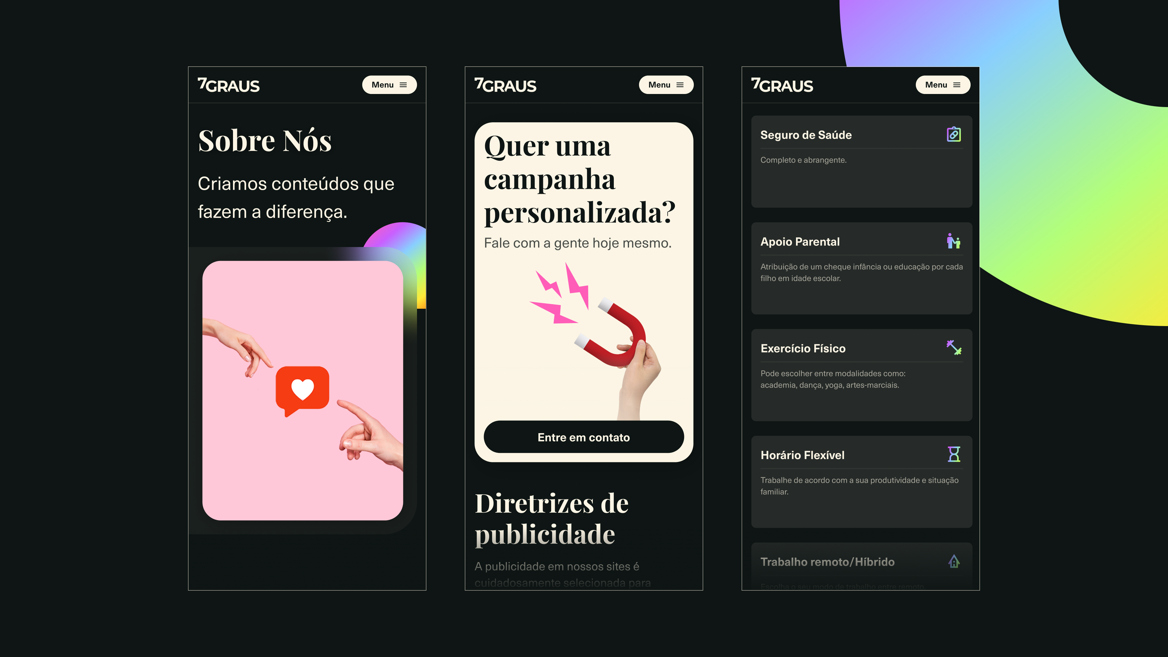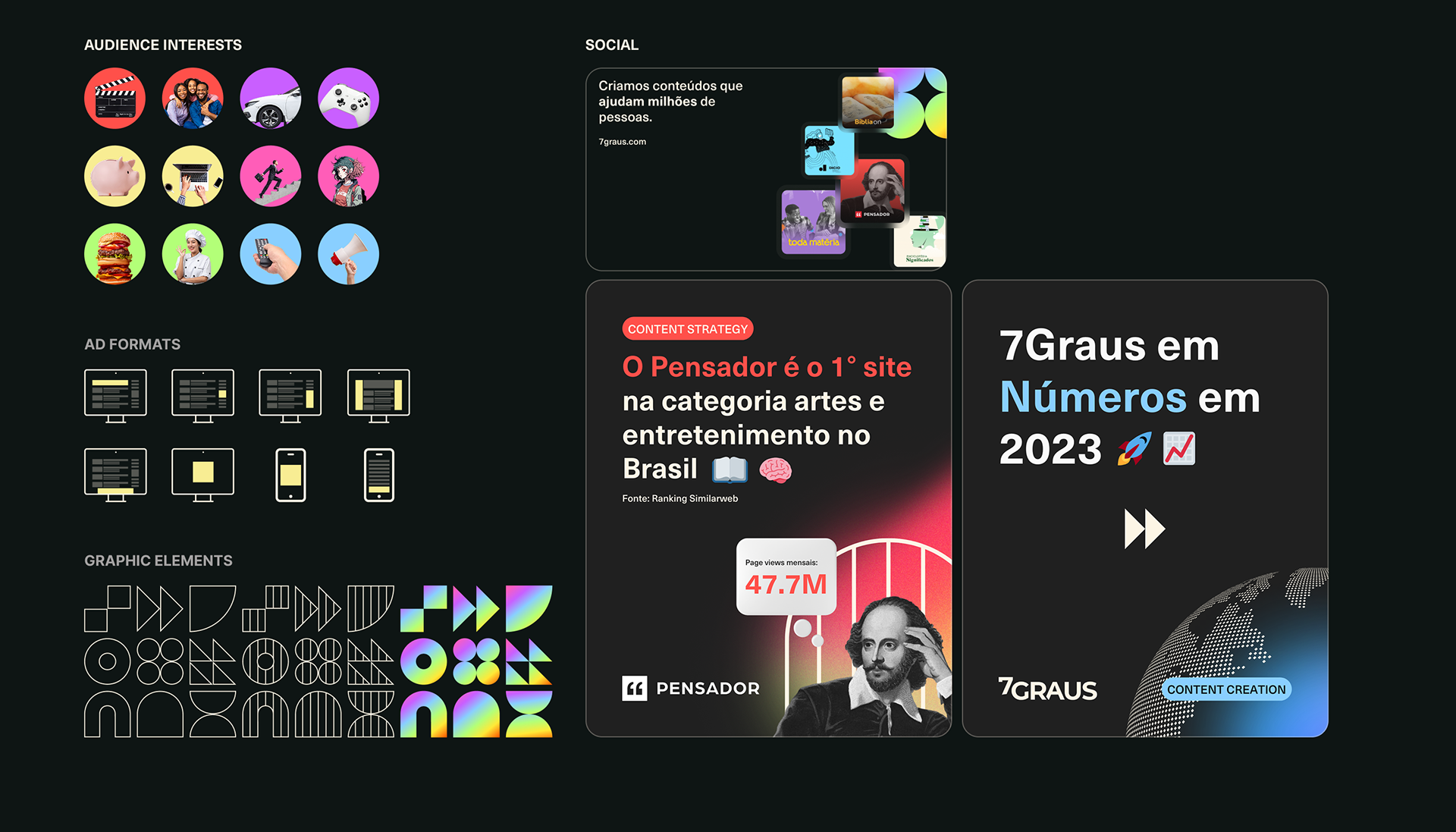 The color palette follows a 60-30-10 rule. These accents were strategically used to represent 7Graus's diverse content verticals (education, technology, culture, etc.). The neutral colors also allowed 7Graus and other brands from the portfolio to not compete with other visually.